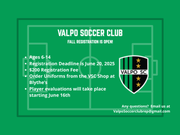 We are excited to announce that the Valpo Soccer Club Fall 2025 registration opens tomorrow, May 23rd, 2025. We look forward to welcoming back familiar faces and introducing new players and coaches to our soccer community.